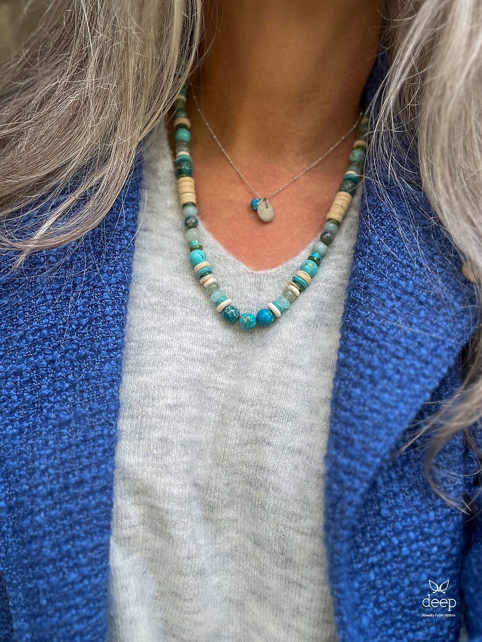 שרשרת קצרה וייחודית שתיקח אותך ישר לחוף הים, בשילוב מושלם של אבני ג׳ספר, היוליט, טורקיז אפריקאי ואמזונייט. גווני הכחול הטבעיים יוצרים הרמוניה מרגיעה ומכניסים את תחושת המים והחופש לכל רגע ביום.